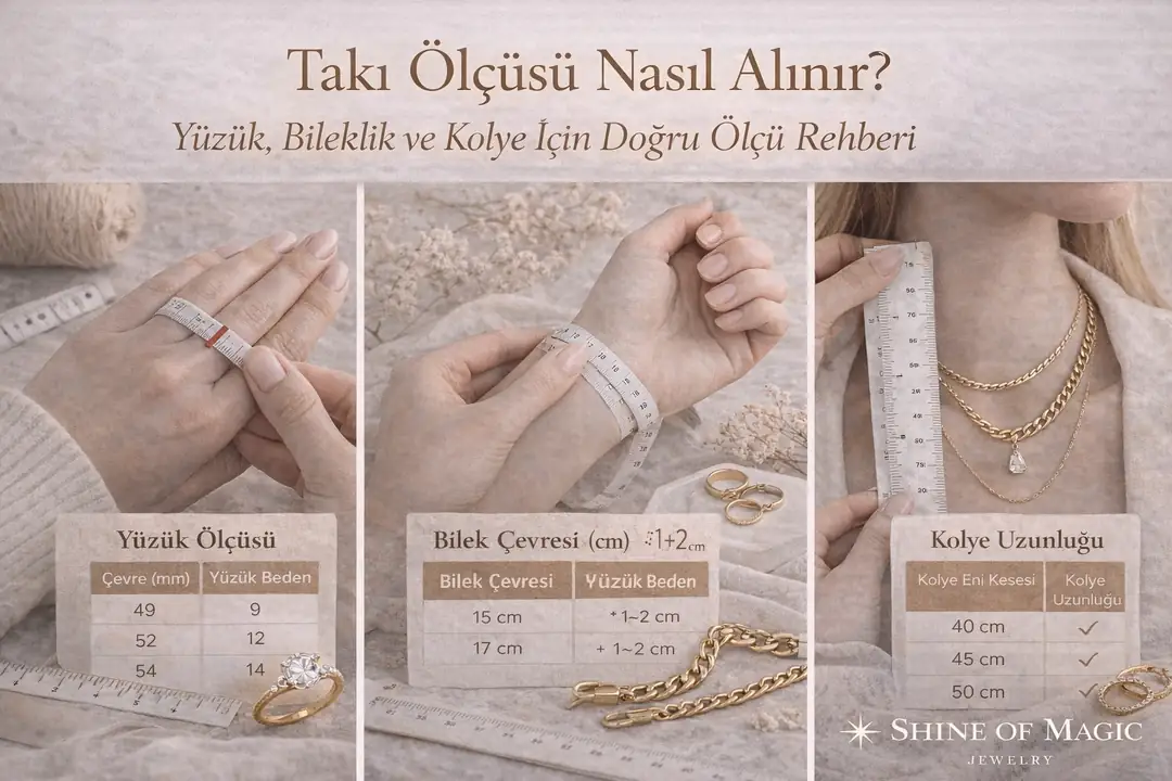 Takı ölçüsünü doğru almak, hem estetik hem de kullanım konforu açısından büyük fark yaratır. Yüzük, bileklik ve kolyelerde doğru ölçü; takının görünümünü ve kullanım keyfini doğrudan etkiler.